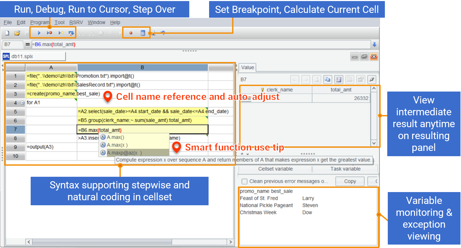 | 3 | =A1.groups(Area;top(10;-Amount)) | GET TopN from each group |
